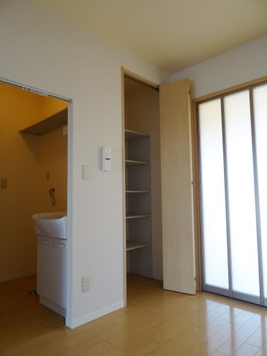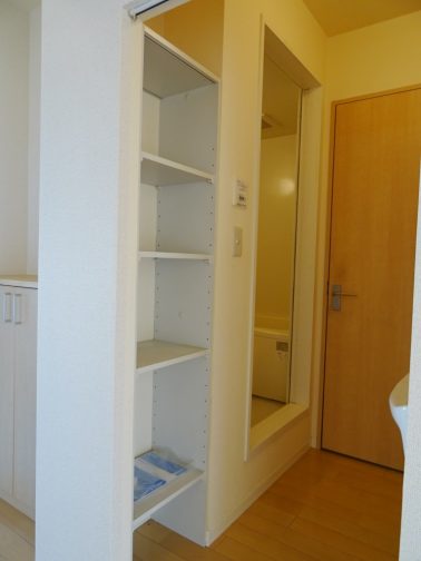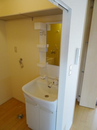 収納豊富、洗面所にタオル等の収納に便利な棚が御座います。